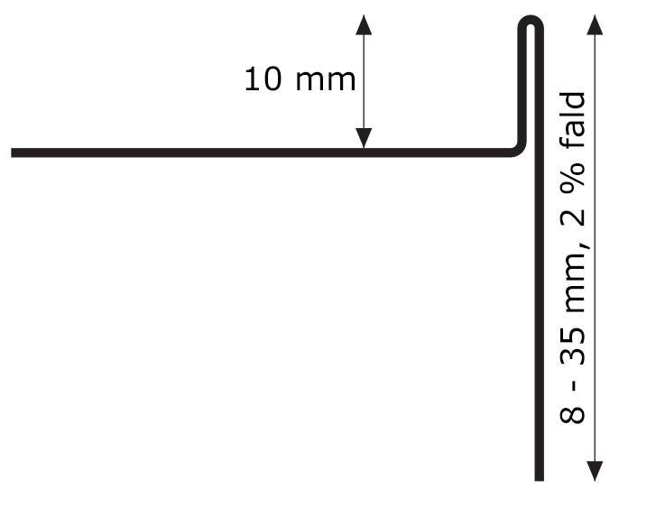 Den rustfrie gulvprofil er 135 cm lang og passer til en 10 mm gulvflise. Kilen går fra 8 mm i den smalle ende til 35 mm i høje ende. Denne variant er til venstre side af brusenichen, når du kigger i retning af afløbet. Fotoet viser en gulv til gulvprofil til højre side.